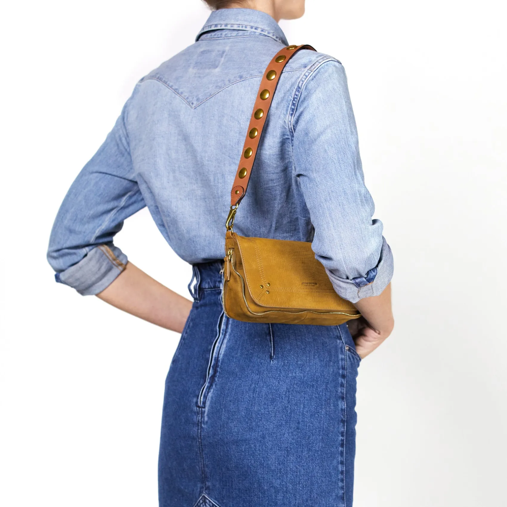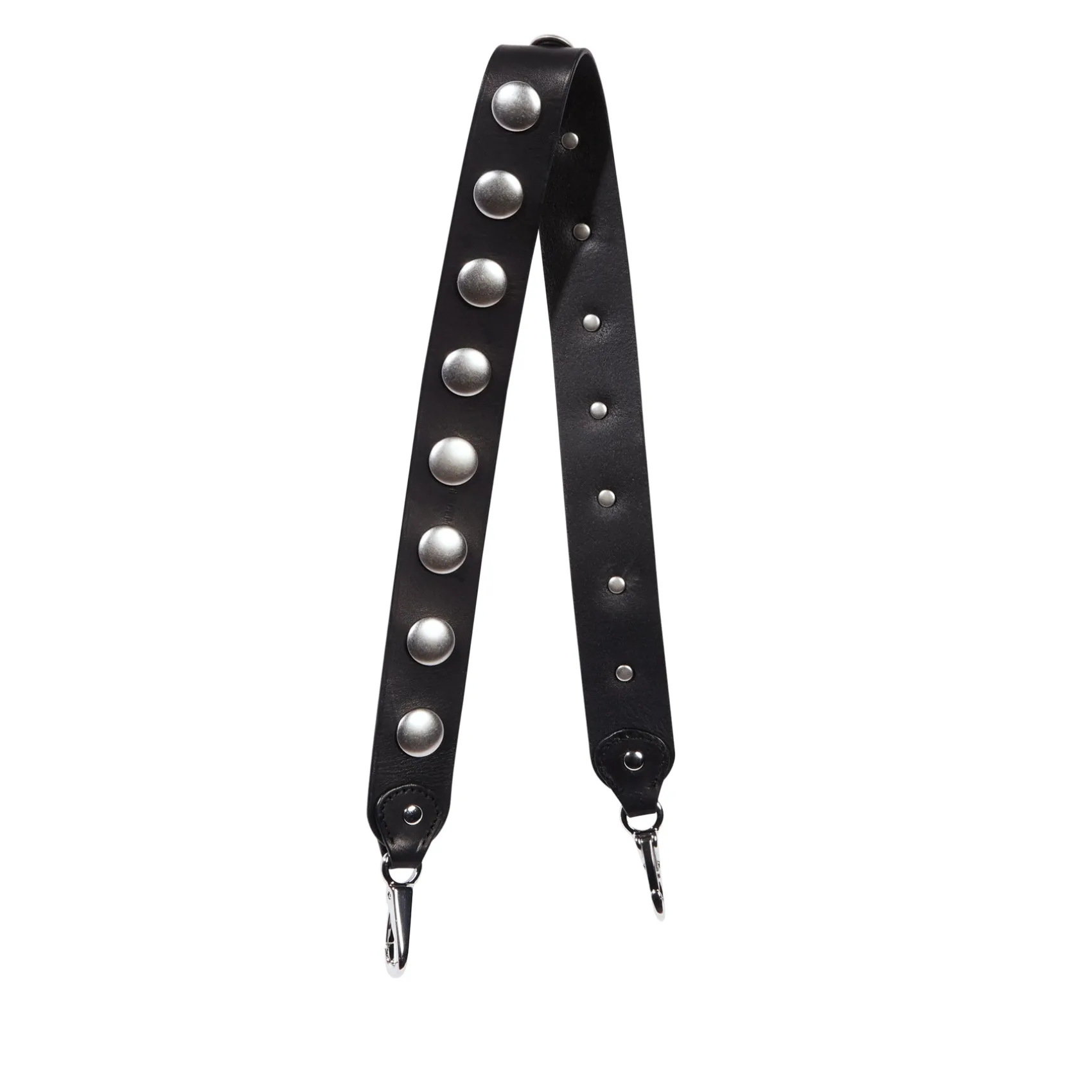 Short strip of genuine vegetable cowhide studded with large rounded metal studs and a hook at either end. Can be associated with Bobi, Igor, Lulu (S,M), Stan Panier M, Billy Nano, Pepito (S,M), RogerStrap 100% CowskinDimensions : 64 cm