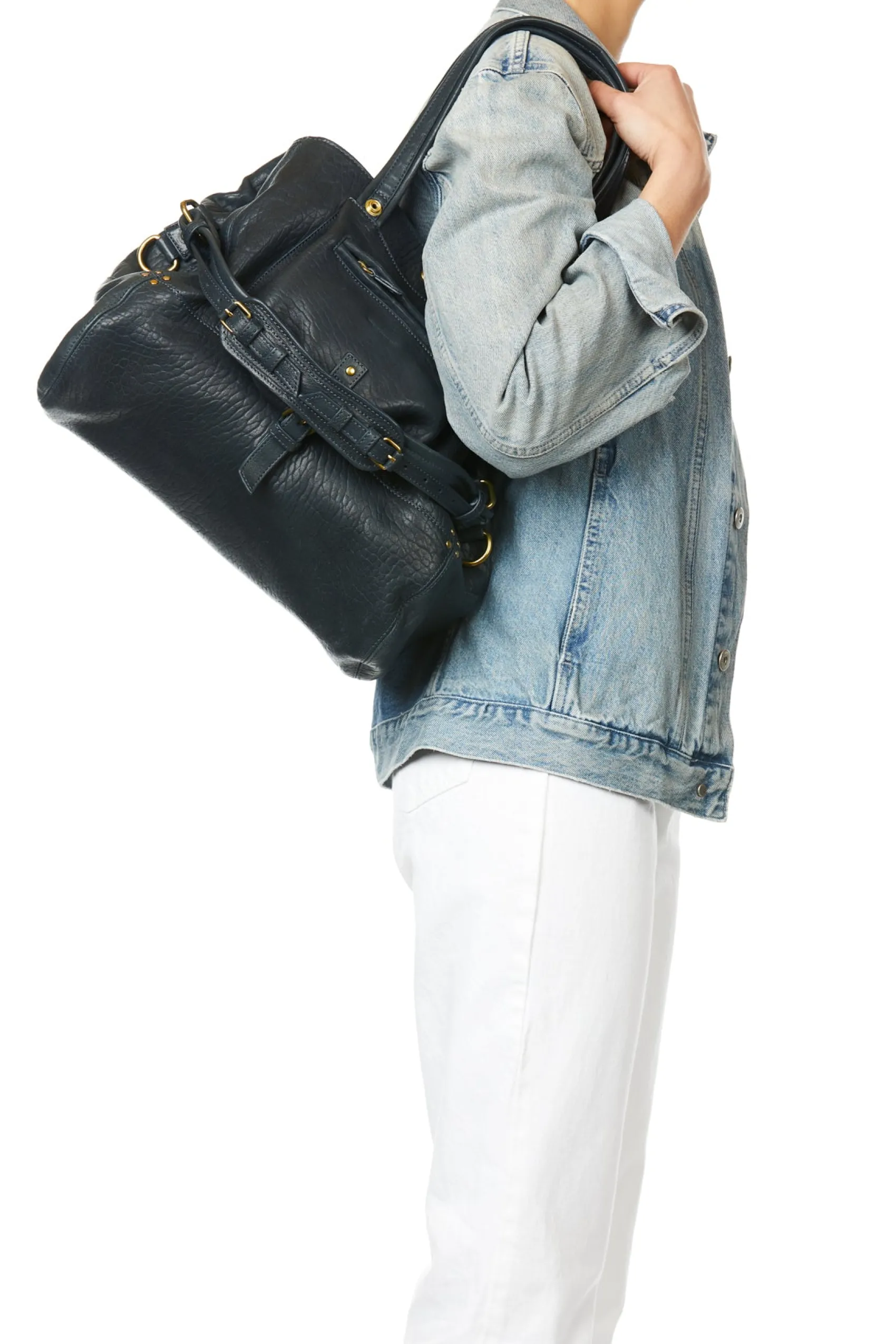 Two leather handles measuring 25cm, maximum lenght 50 cm. Non-adjustable leather strap measuring 48 cm. One exterior zipped pocket on the front. One interior pocket. One key hook inside.