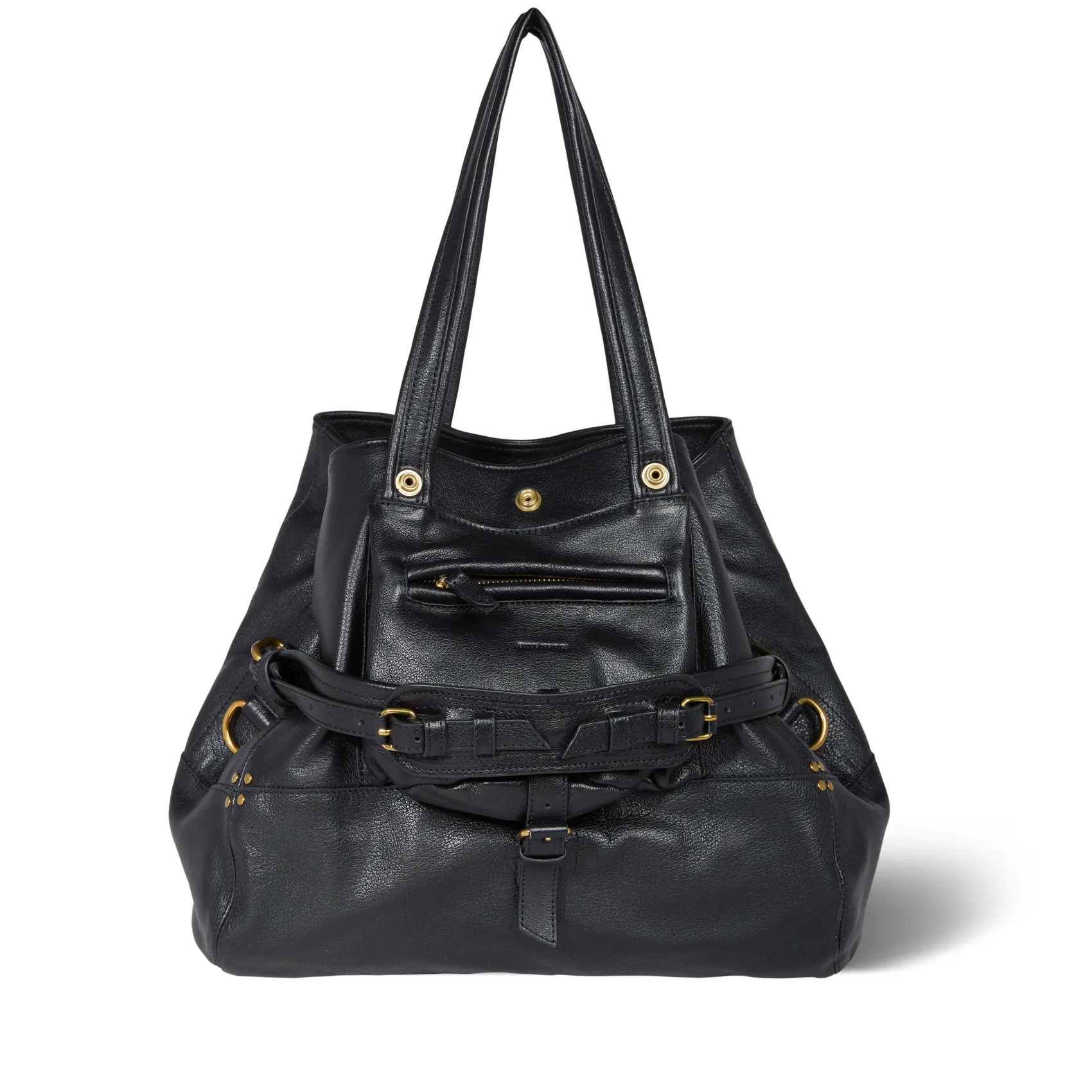 Two leather handles measuring 25cm, maximum lenght 50 cm. Non-adjustable leather strap measuring 48 cm. One exterior zipped pocket on the front. One interior pocket. One key hook inside.