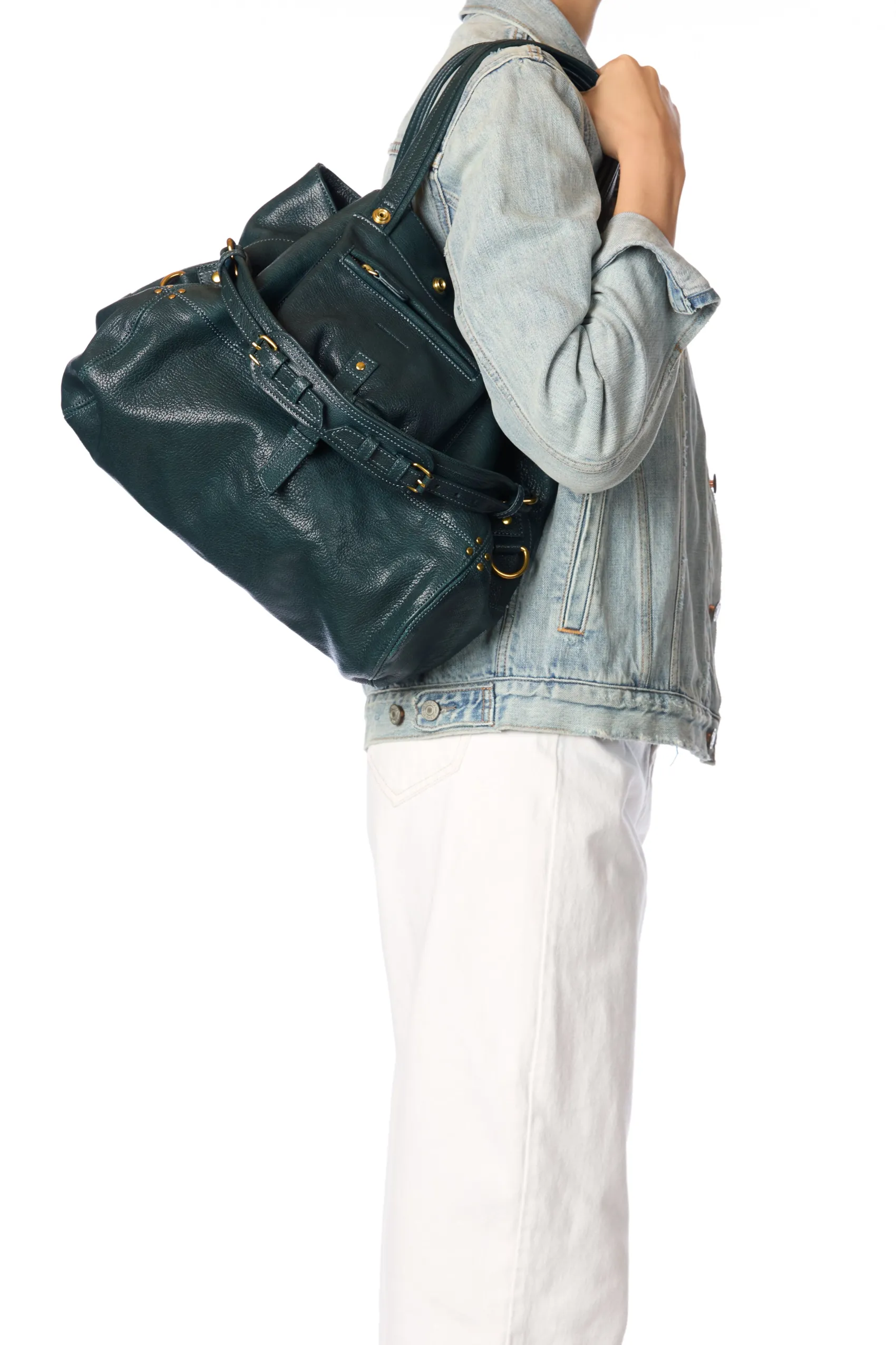 Two leather handles measuring 25cm, maximum lenght 50 cm. Non-adjustable leather strap measuring 48 cm. One exterior zipped pocket on the front. One interior pocket. One key hook inside.