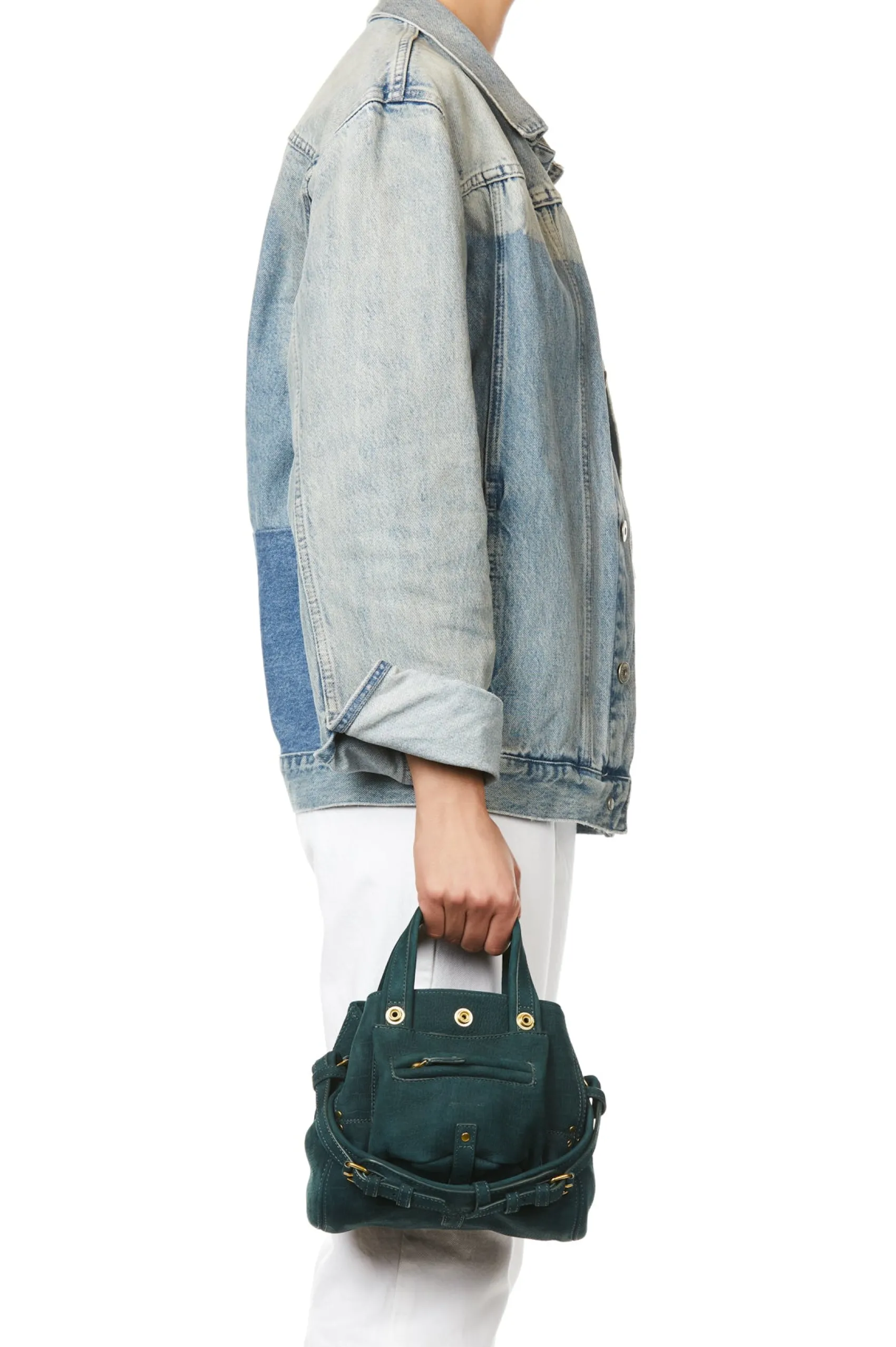 Two leather handles on the top of the bag, height 9 cm. A removable and adjustable leather shoulder strap of maximum 130cm. One external zipped pocket on the front of the bag. One inside pocket. A key ring inside the bag.