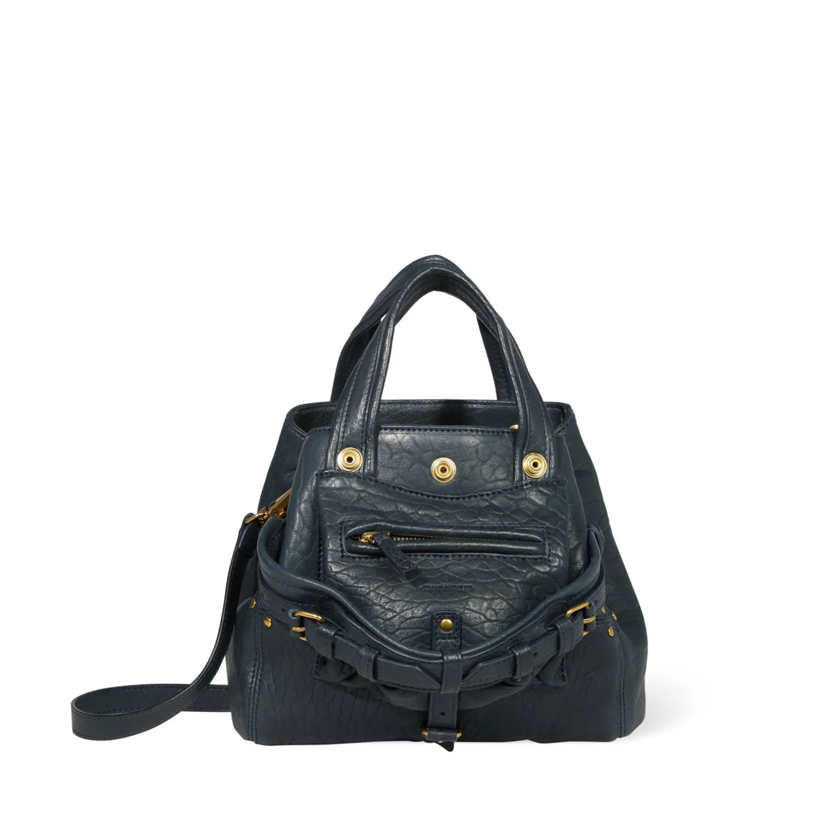 Two leather handles on the top of the bag, height 9 cm. A removable and adjustable leather shoulder strap of maximum 130cm. One external zipped pocket on the front of the bag. One inside pocket. A key ring inside the bag.