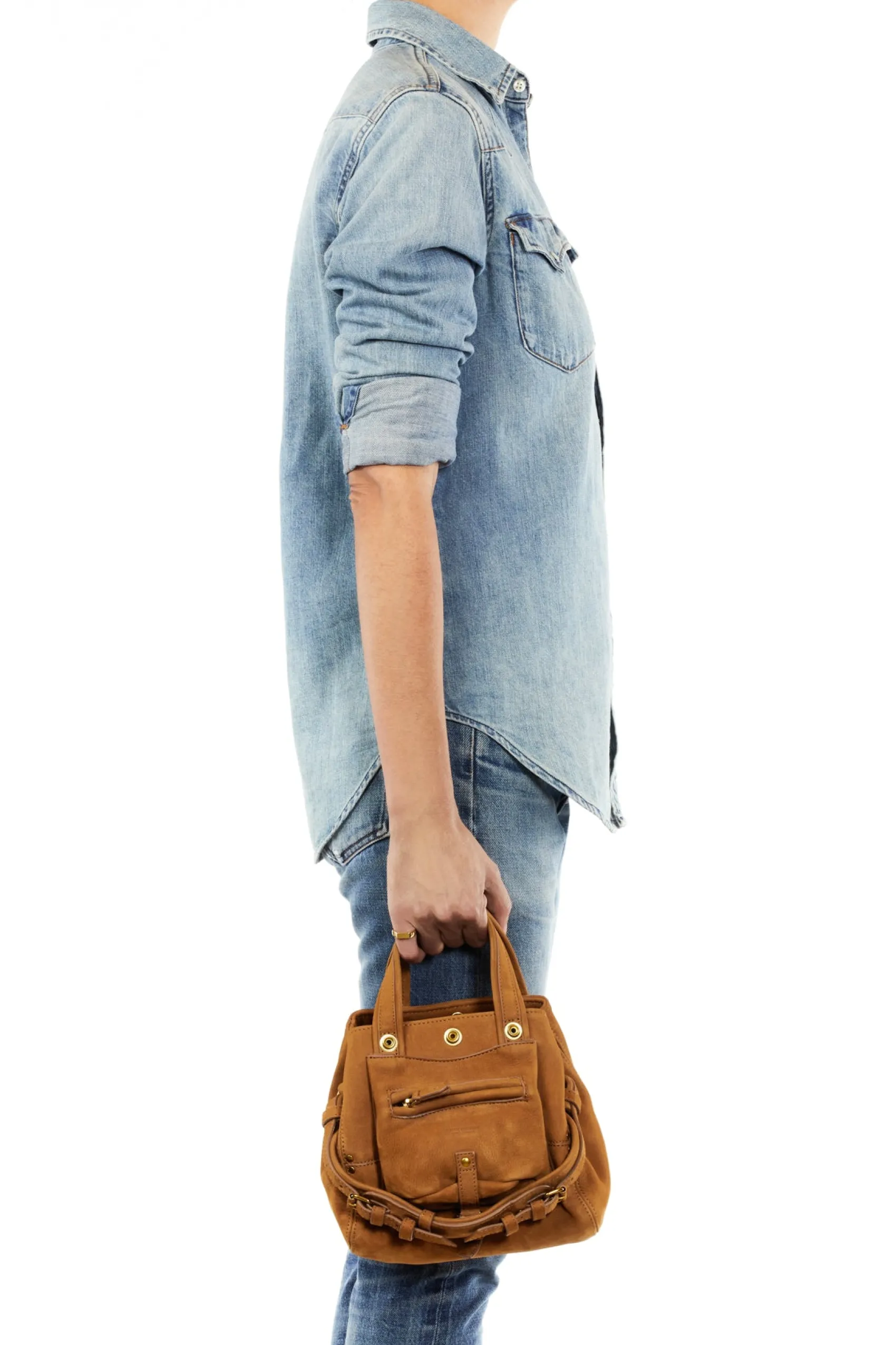 Two leather handles on the top of the bag, height 9 cm. A removable and adjustable leather shoulder strap of maximum 130cm. One external zipped pocket on the front of the bag. One inside pocket. A key ring inside the bag.