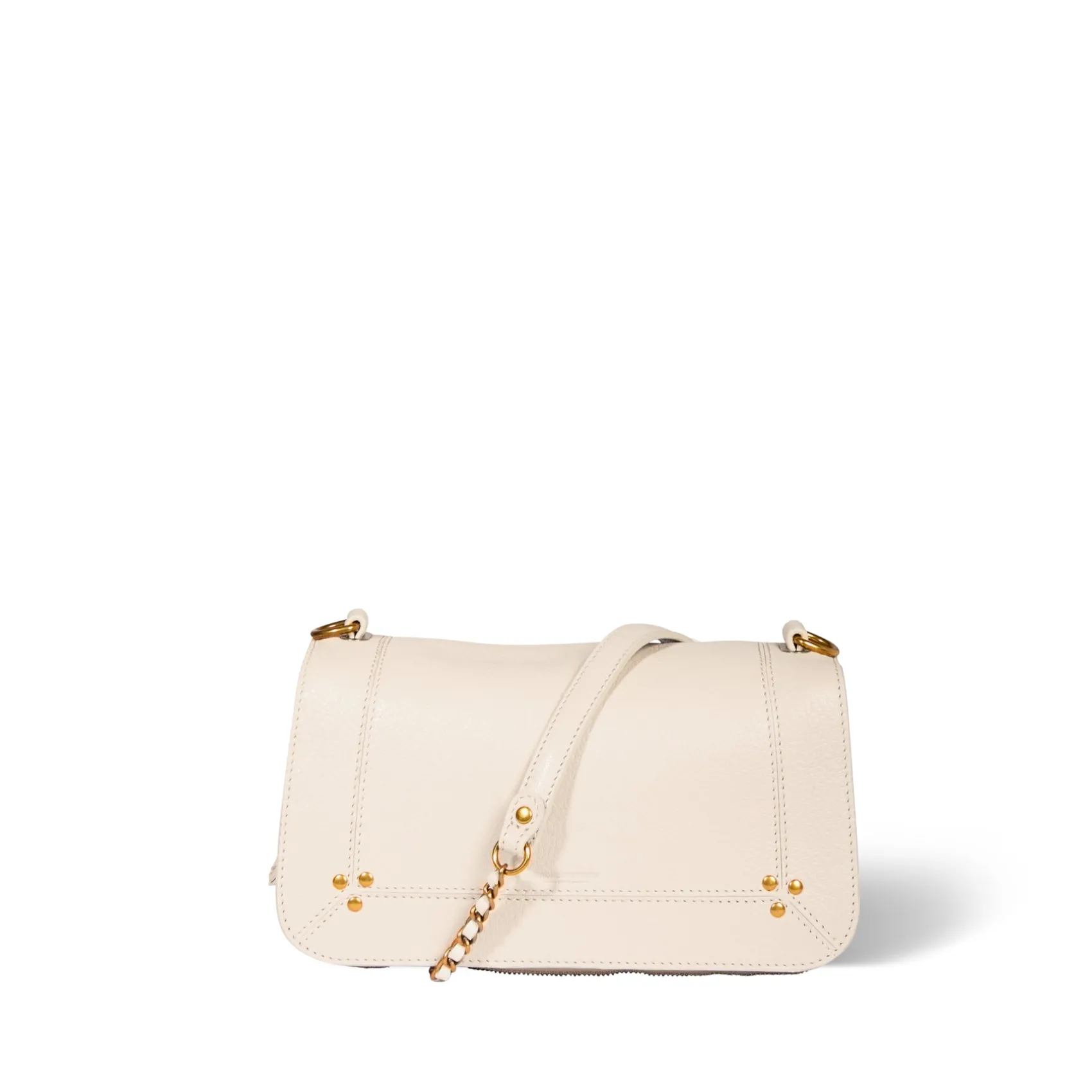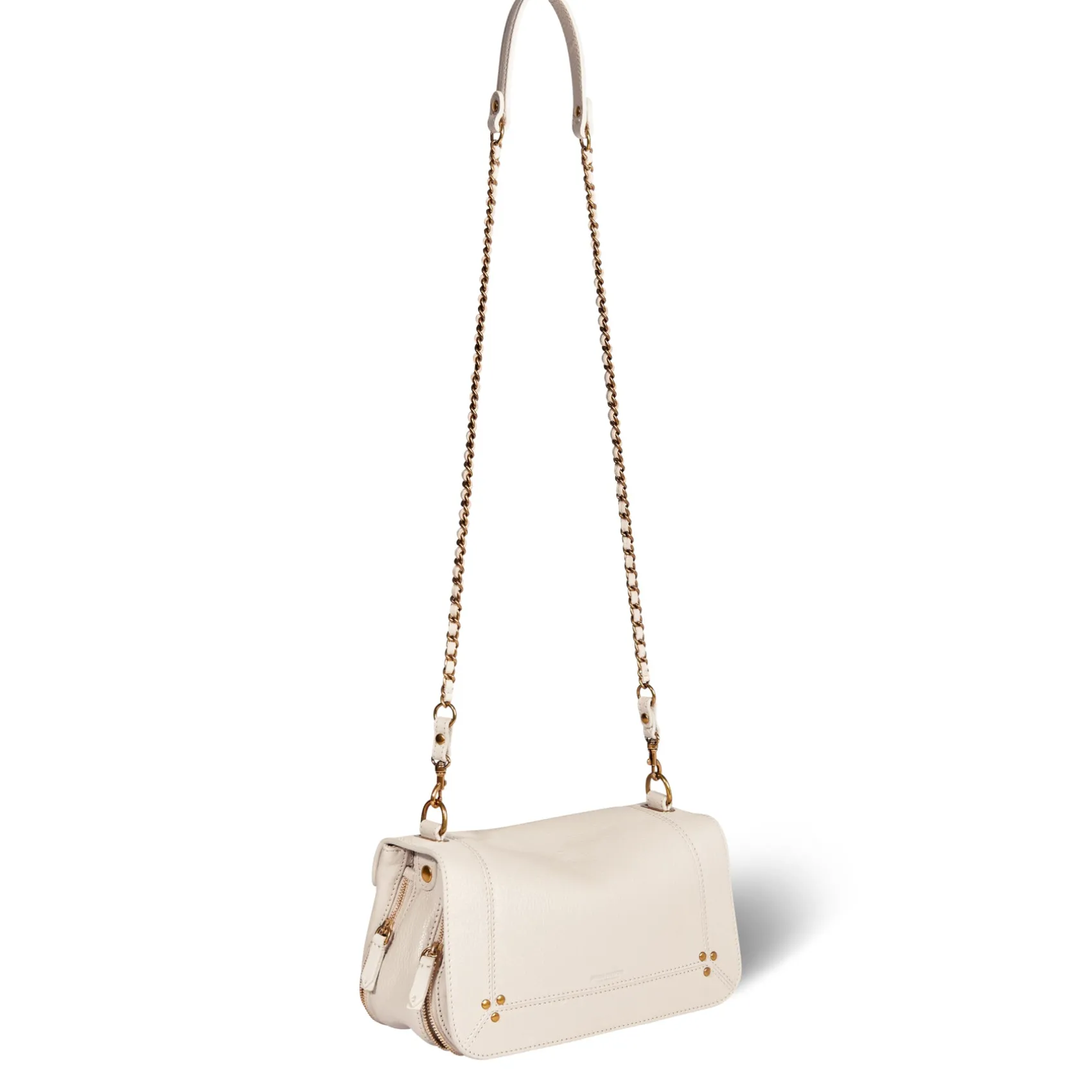 Leather and chain shoulder strap adjustable and two lengths : 65 cm or 105 cm. Leather flap with a double magnetic fastening. Three pouch compartments. Two zip gussets to adjust size. One detachable mirror and key hook inside.