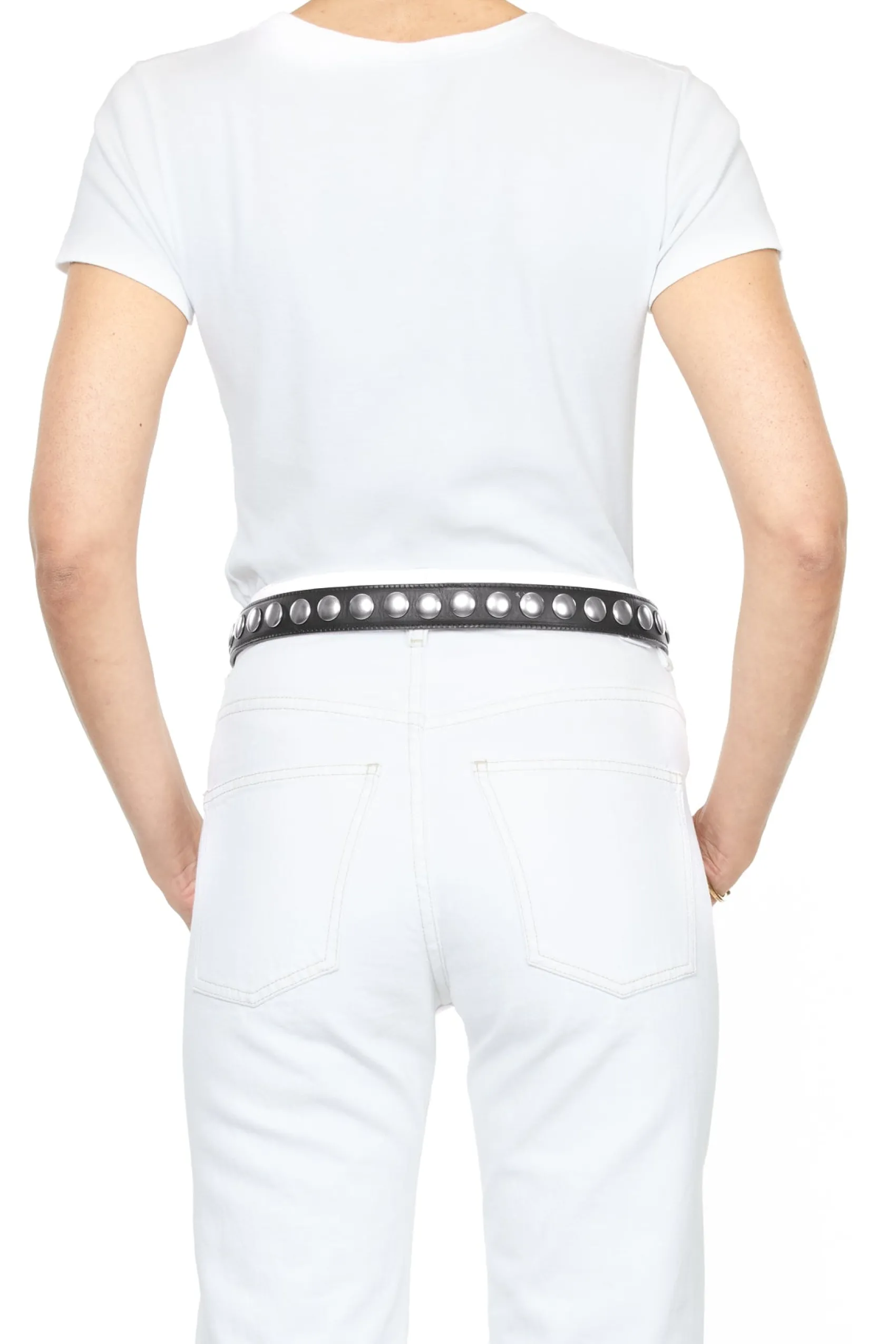 Belt with large domed metal rivets. Adjustable waistband. Can be worn hip-high or high-waisted.