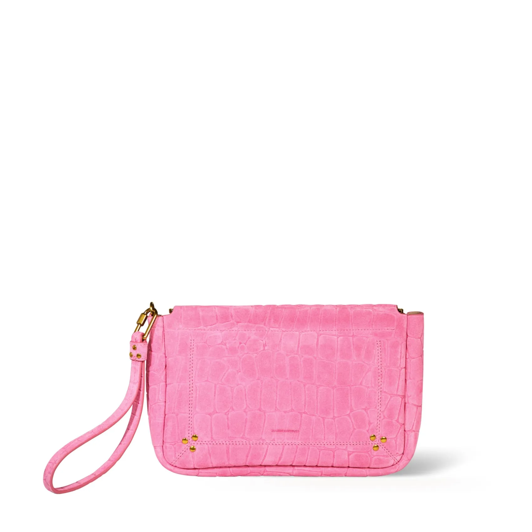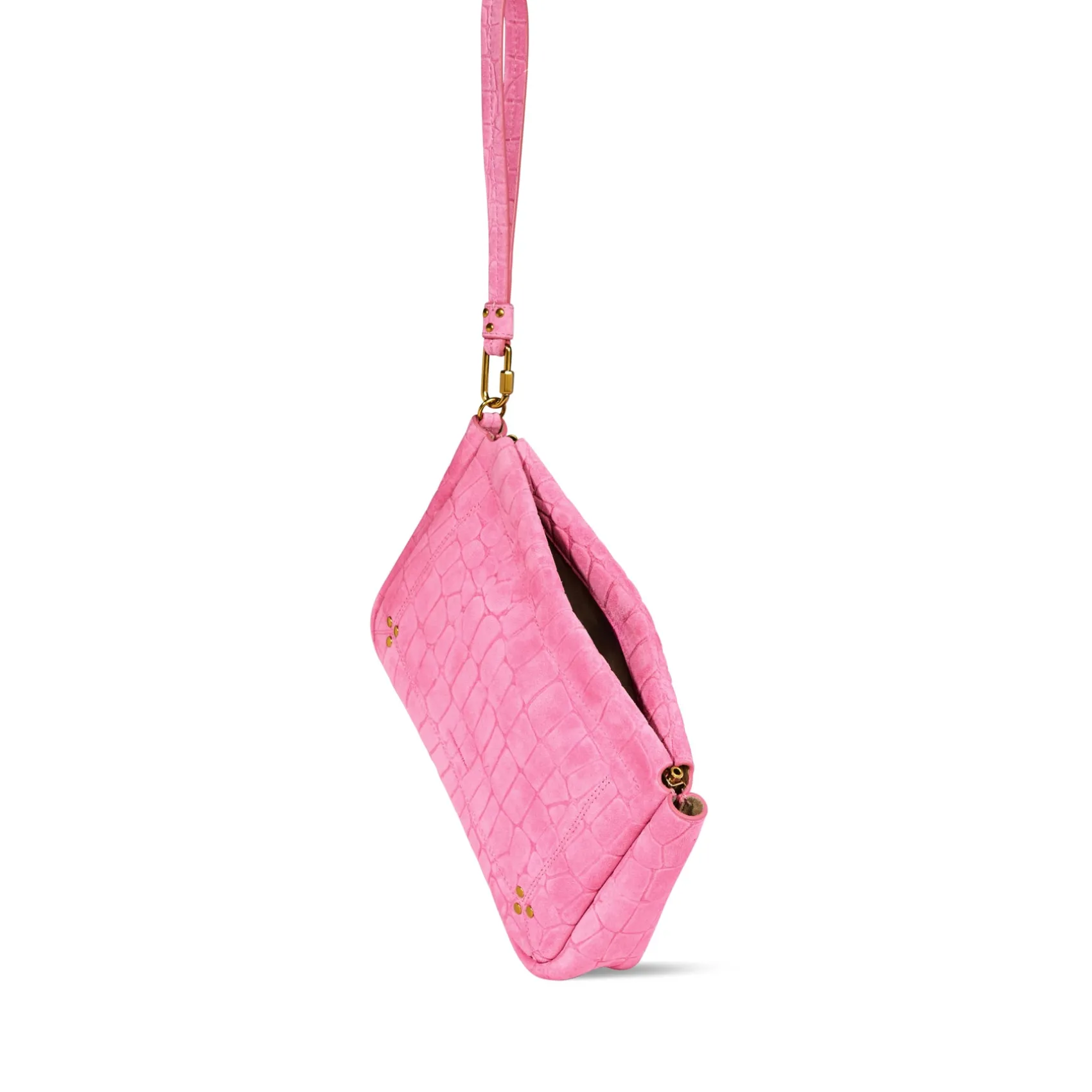 Hand-held, or to slip into a large tote bag. Removable strap thanks to the screw carabiner. Snap closure.