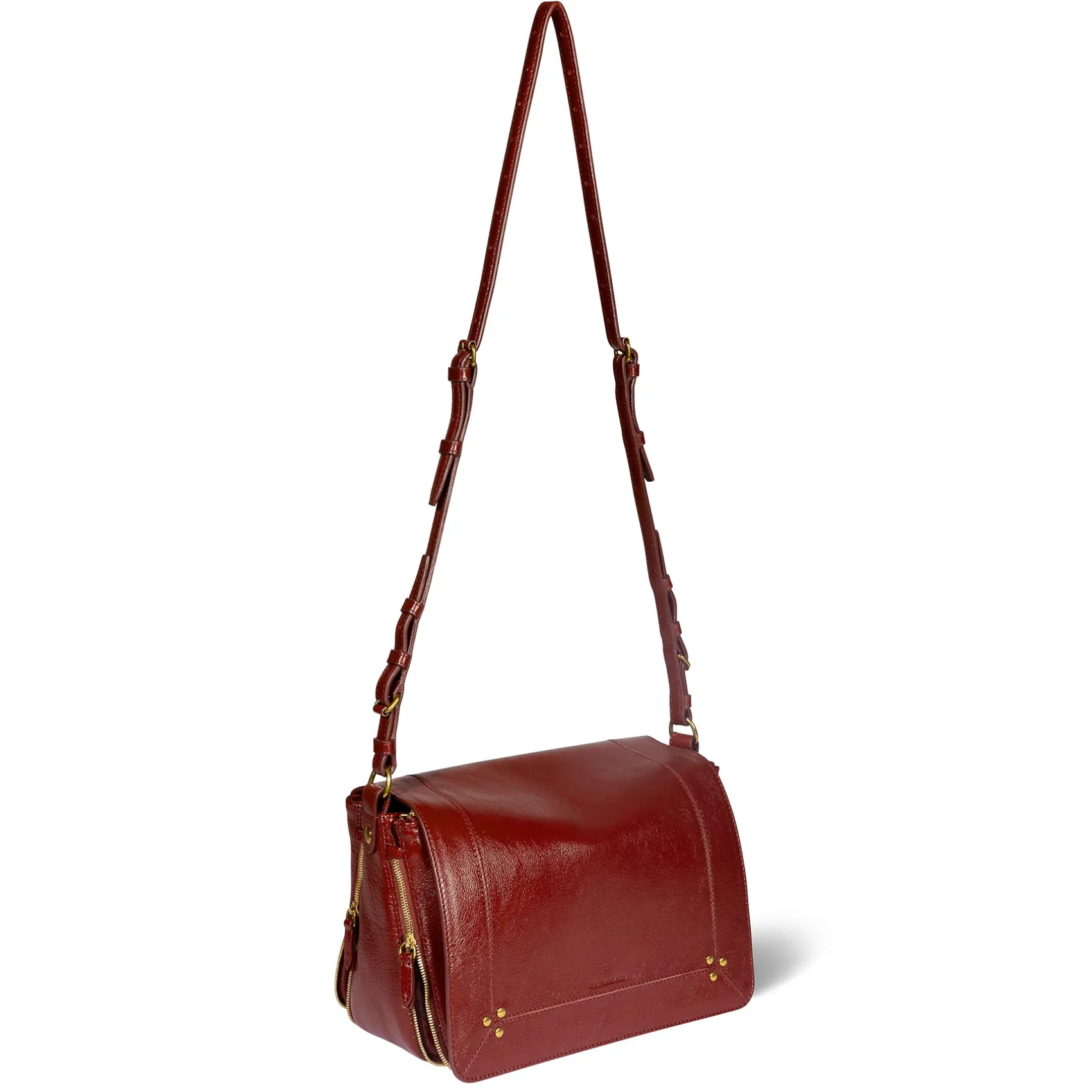 Leather flap with magnetic snap fastening. Adjustable leather shoulder strap measuring 100cm. Two zipper gussets and adjust size. Three compartments, with one zipped compartment with for cards. One key hook inside.