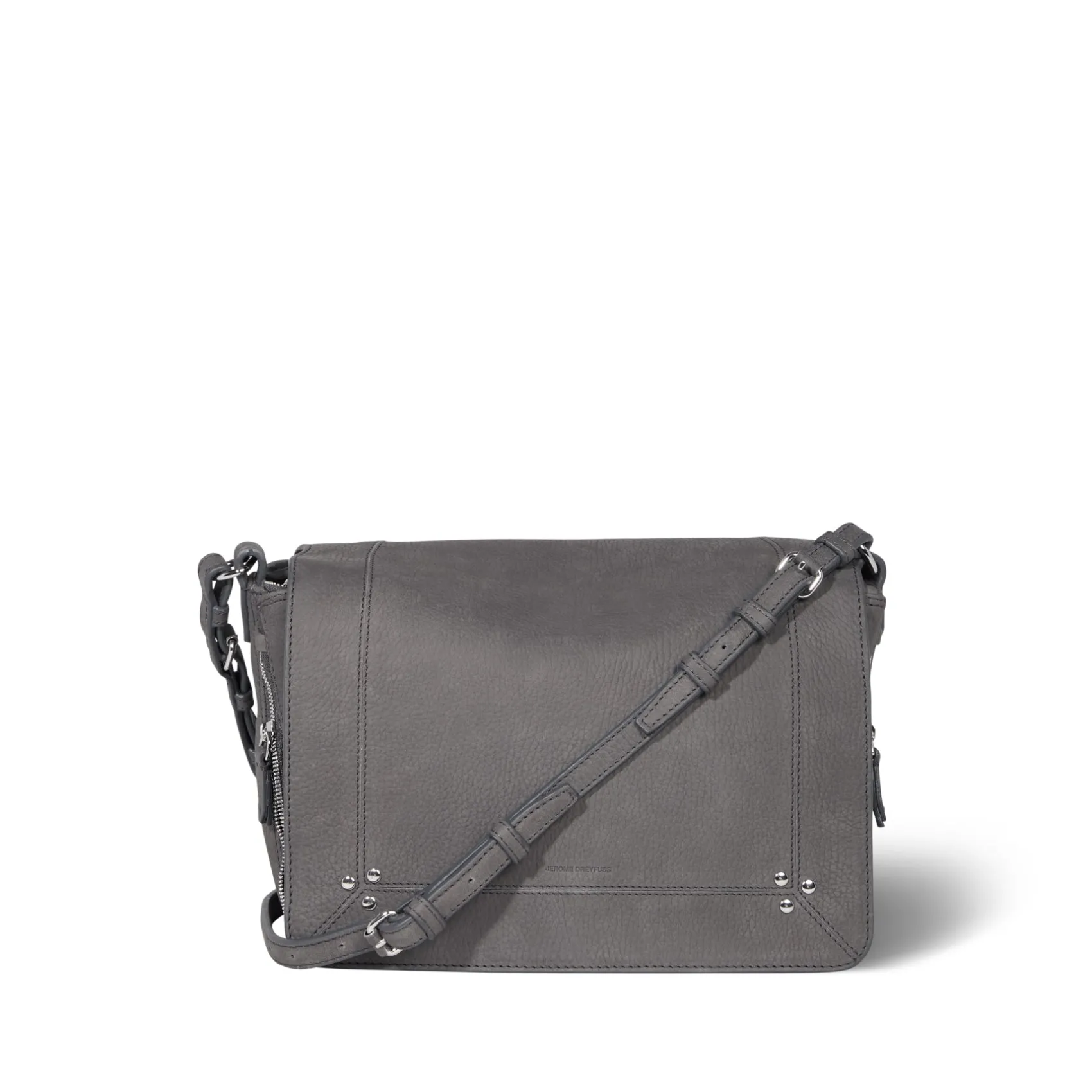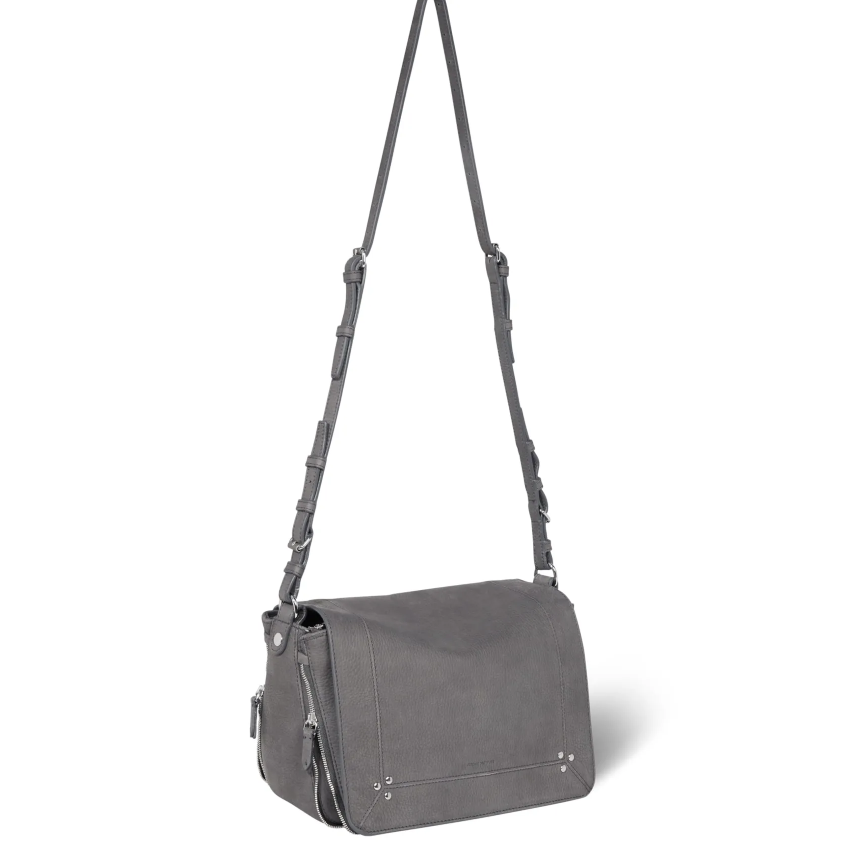 Leather flap with magnetic snap fastening. Adjustable leather shoulder strap measuring 100cm. Two zipper gussets and adj…