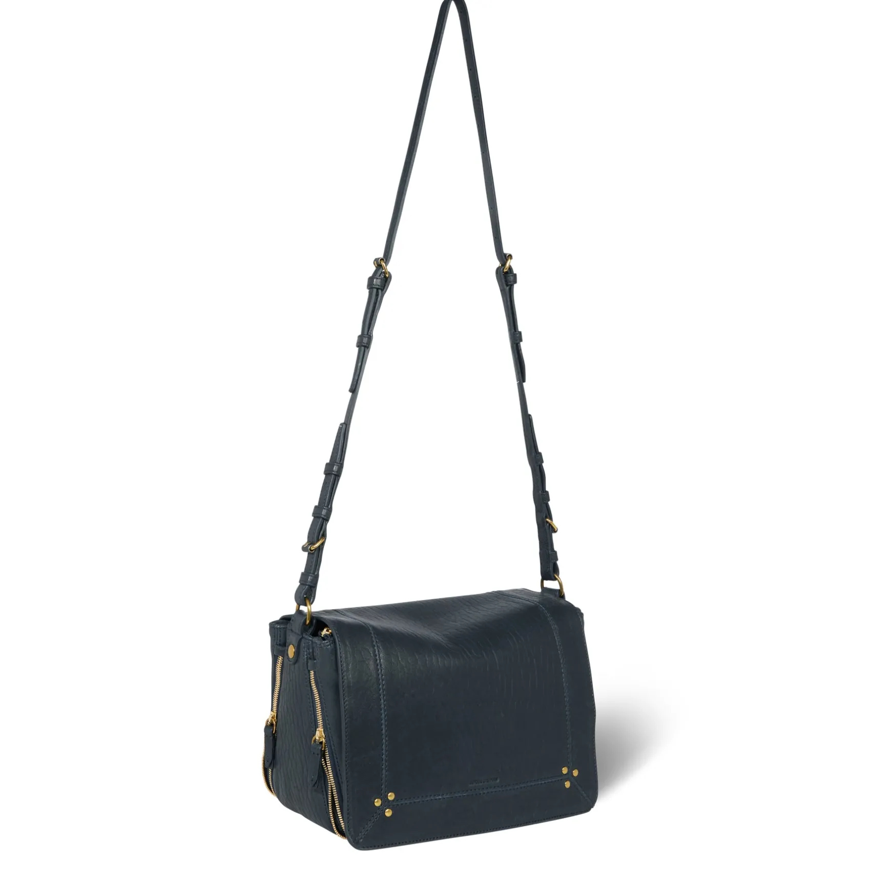 Leather flap with magnetic snap fastening. Adjustable leather shoulder strap measuring 100cm. Two zipper gussets and adj…