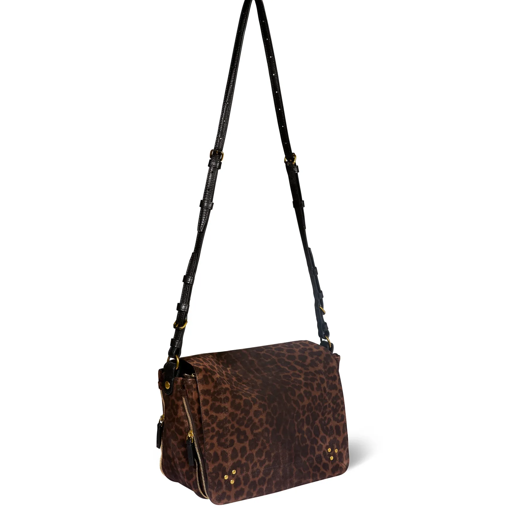 Leather flap with magnetic snap fastening. Adjustable leather shoulder strap measuring 100cm. Two zipper gussets and adj…