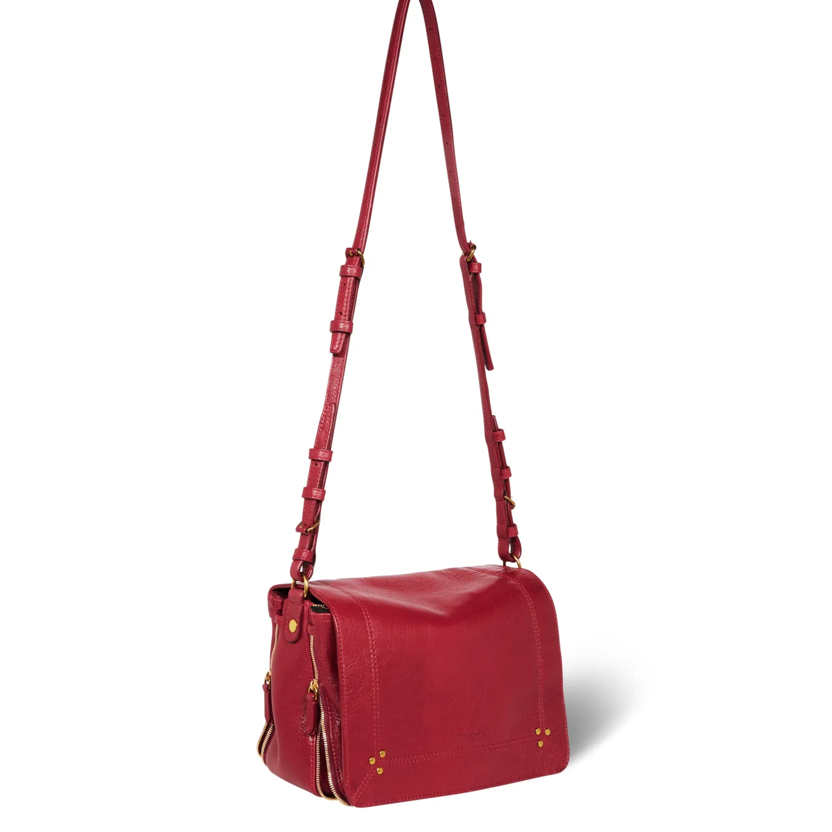 Leather flap with magnetic snap fastening. Adjustable leather shoulder strap measuring 100cm. Two zipper gussets and adj…