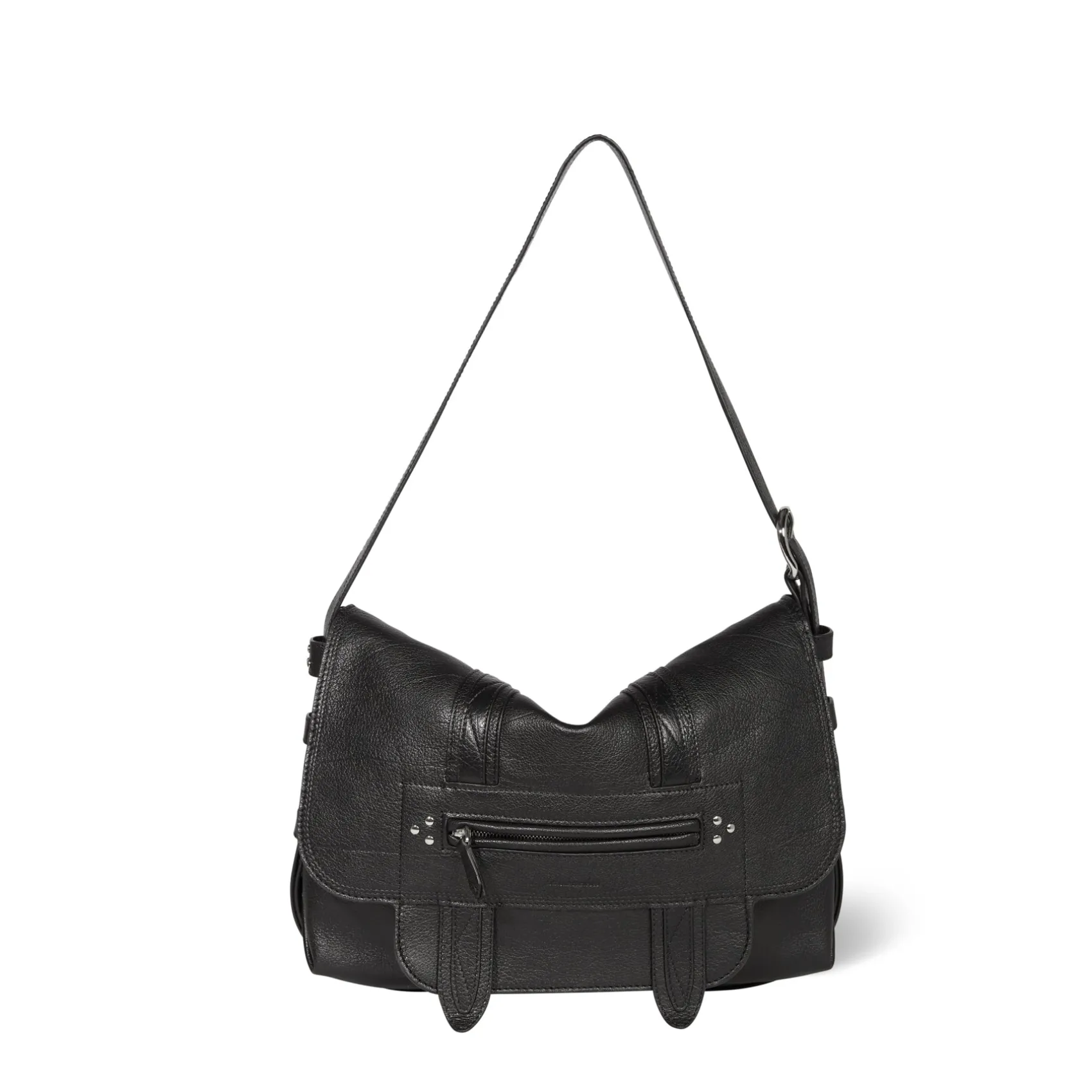 Leather flap with magnetic snap fastening. Adjustable leather shoulder strap measuring a maximum of 101cm. One inside pocket. One zipped outsided pocket.