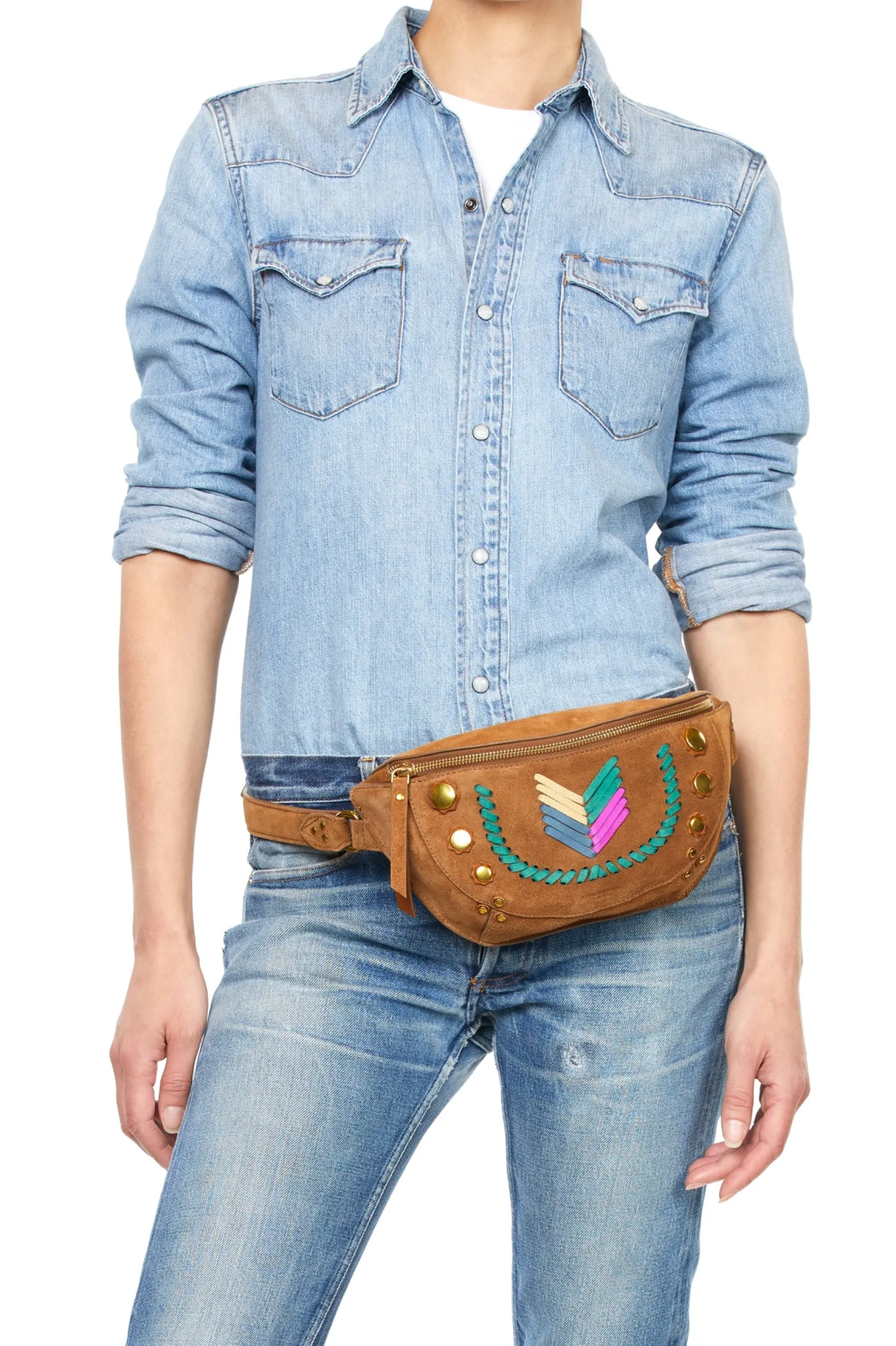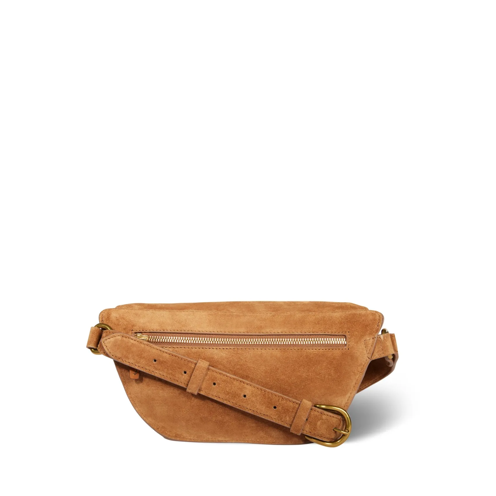 Zipper closure on the top of the bag. An adjustable belt, measuring a maximum of 103 cm. One inside patch pocket. One exterior zippered pocket.