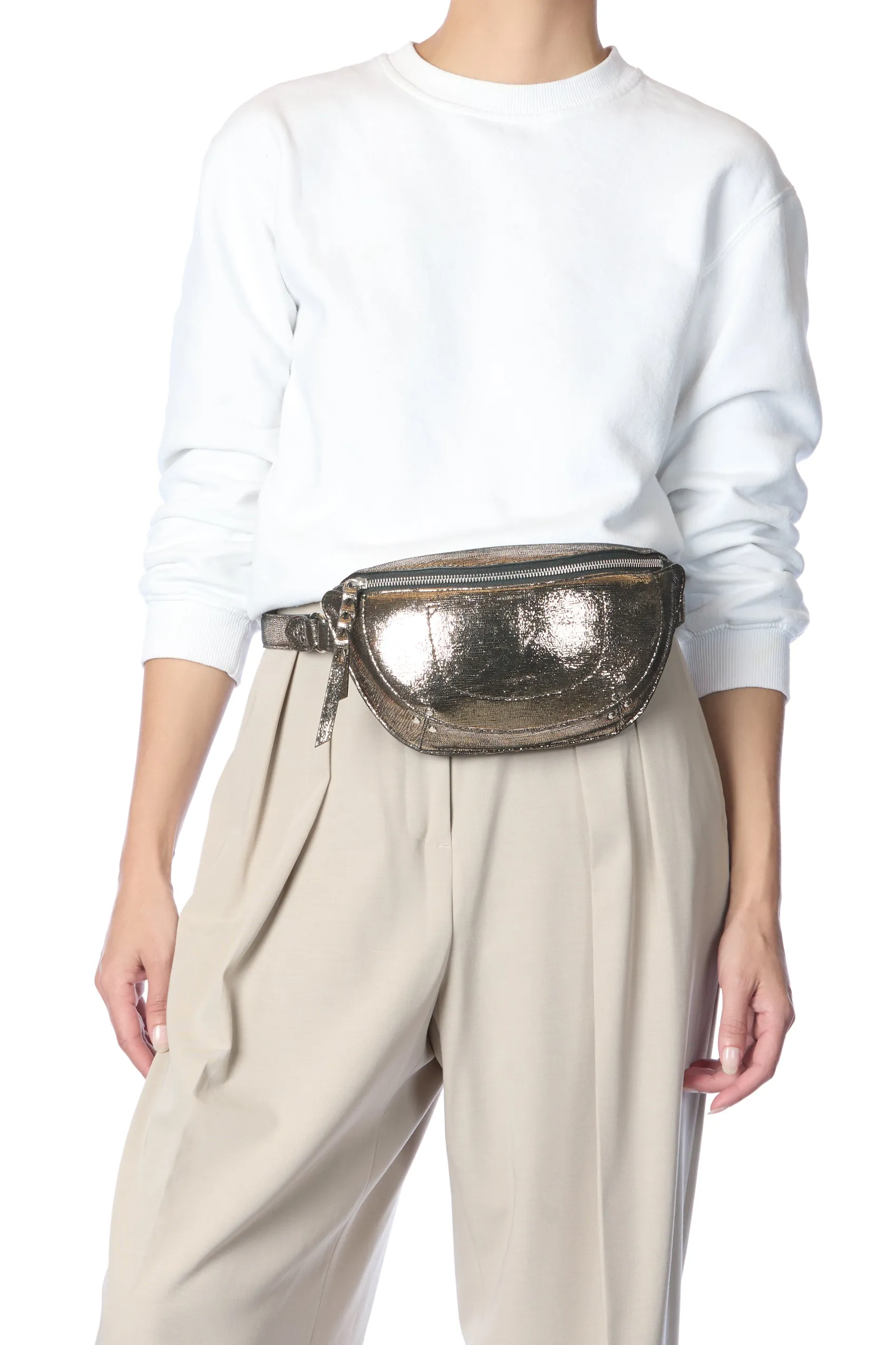 Zipper closure on the top of the bag. An adjustable belt, measuring a maximum of 103 cm. One inside patch pocket. One exterior zippered pocket.