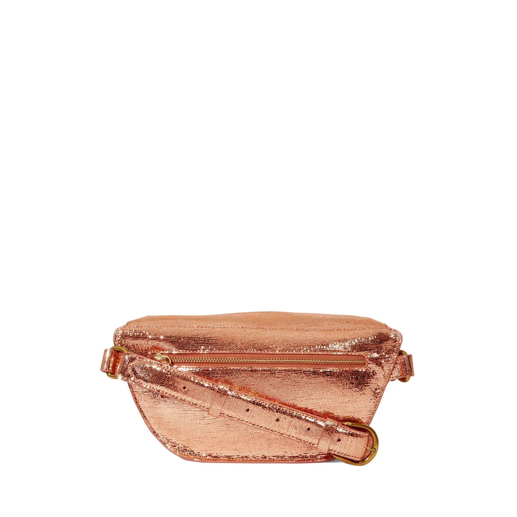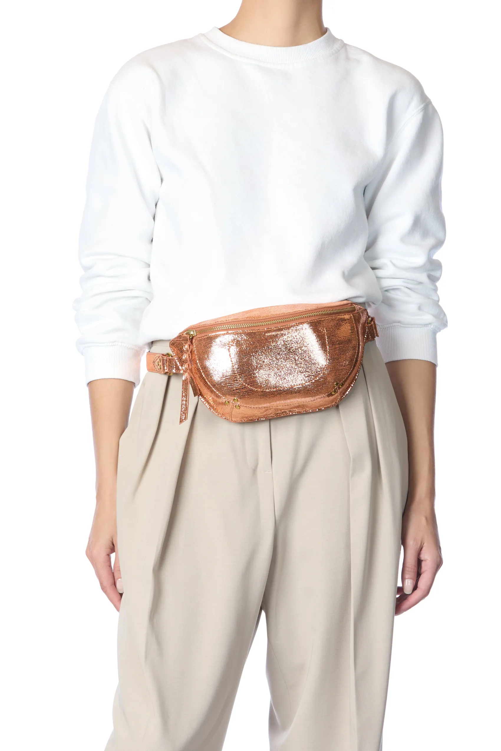 Zipper closure on the top of the bag. An adjustable belt, measuring a maximum of 103 cm. One inside patch pocket. One exterior zippered pocket.