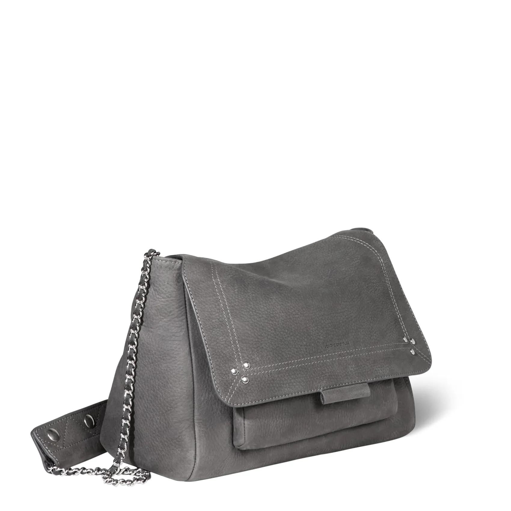 Adjustable chain and leather shoulder strap measuring 105 cm. Wide leg shoulder belt. Flap with snap button closure. One small pocket under the flap. One exterior zipped pocket. One interior pocket. One key hook inside.