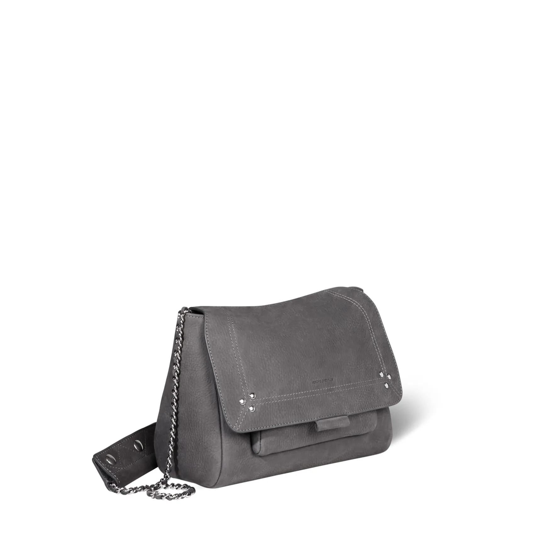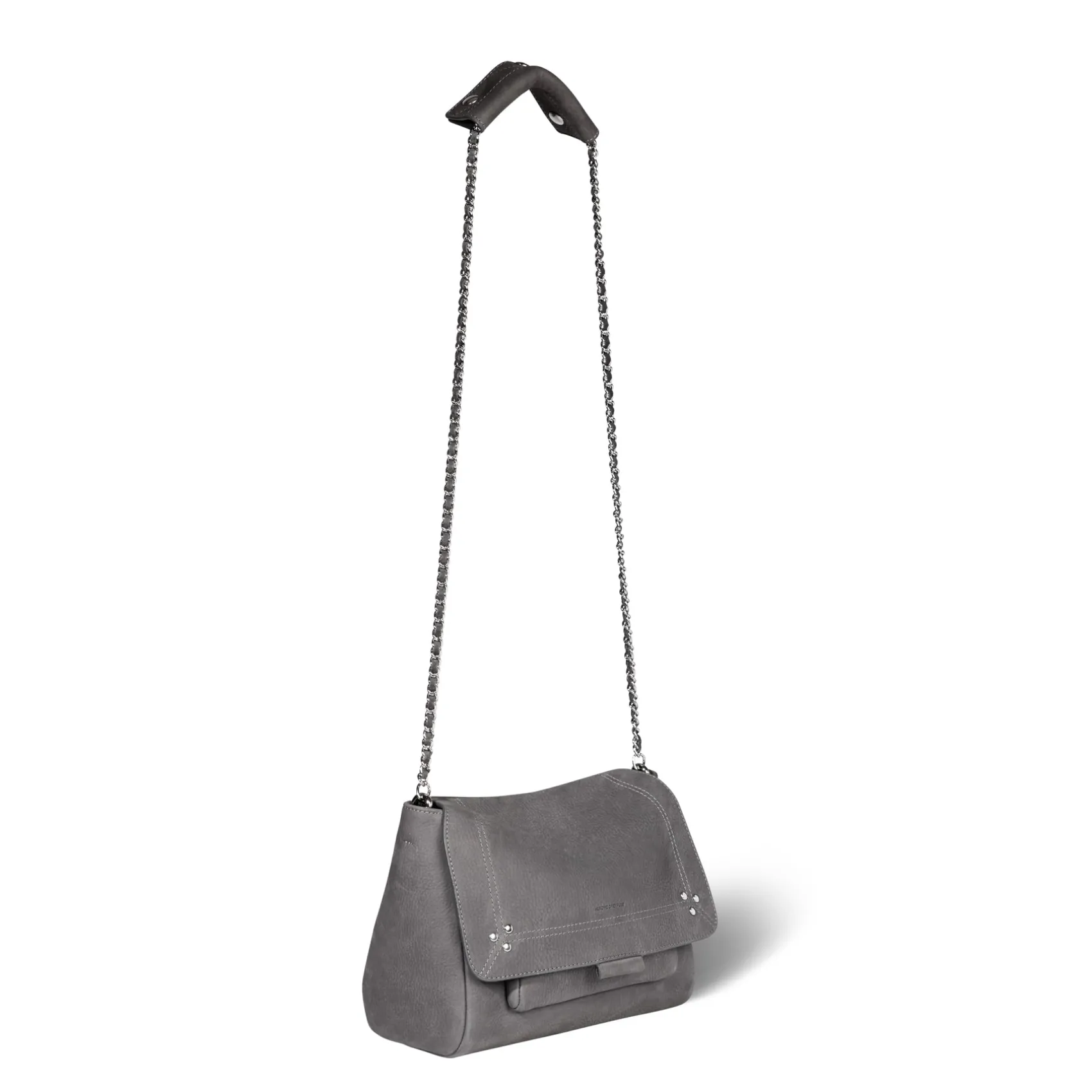 Adjustable chain and leather shoulder strap measuring 105 cm. Wide leg shoulder belt. Flap with snap button closure. One small pocket under the flap. One exterior zipped pocket. One interior pocket. One key hook inside.