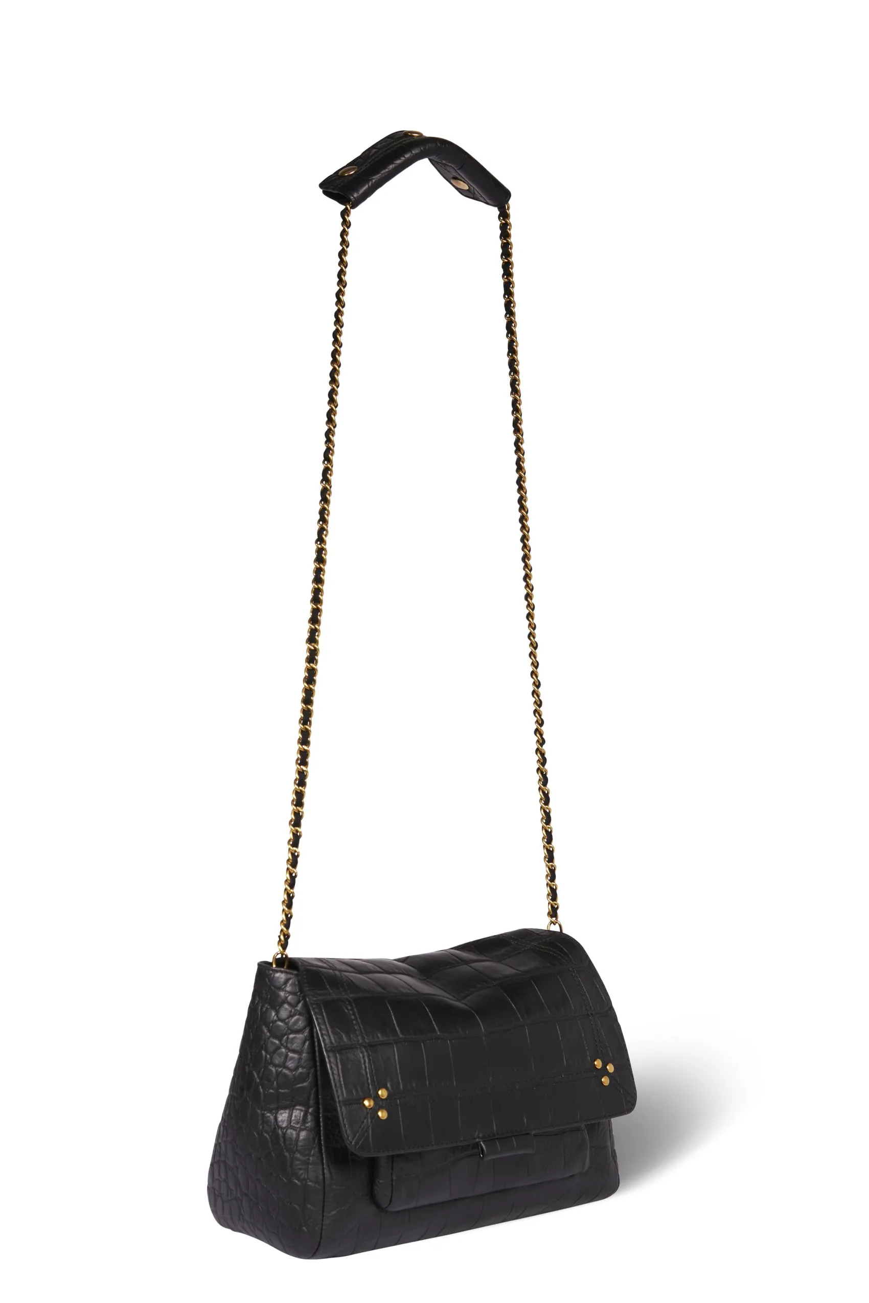 Adjustable chain and leather shoulder strap measuring 105 cm. Wide leg shoulder belt. Flap with snap button closure. One small pocket under the flap. One exterior zipped pocket. One interior pocket. One key hook inside.