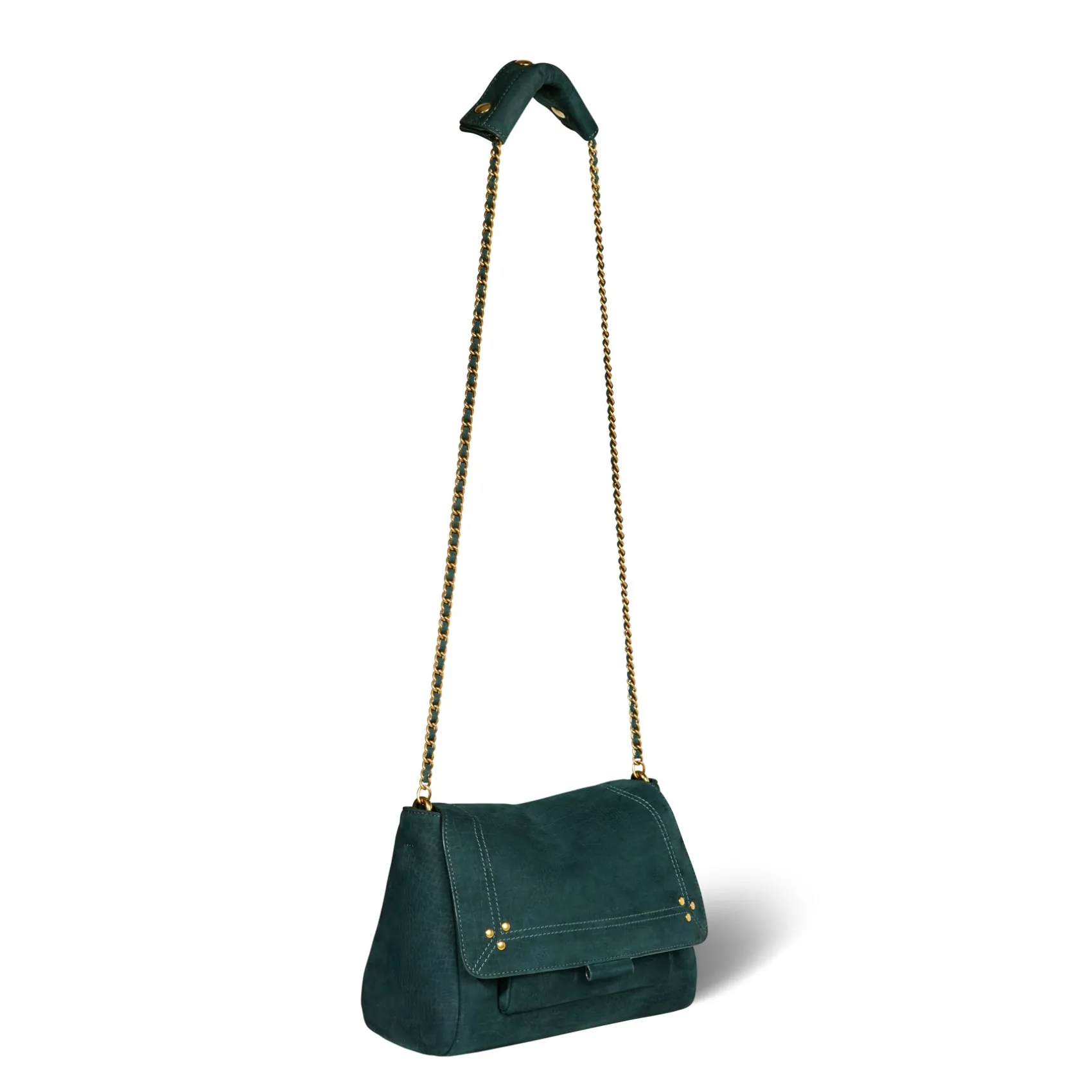 Adjustable chain and leather shoulder strap measuring 105 cm. Wide leg shoulder belt. Flap with snap button closure. One small pocket under the flap. One exterior zipped pocket. One interior pocket. One key hook inside.
