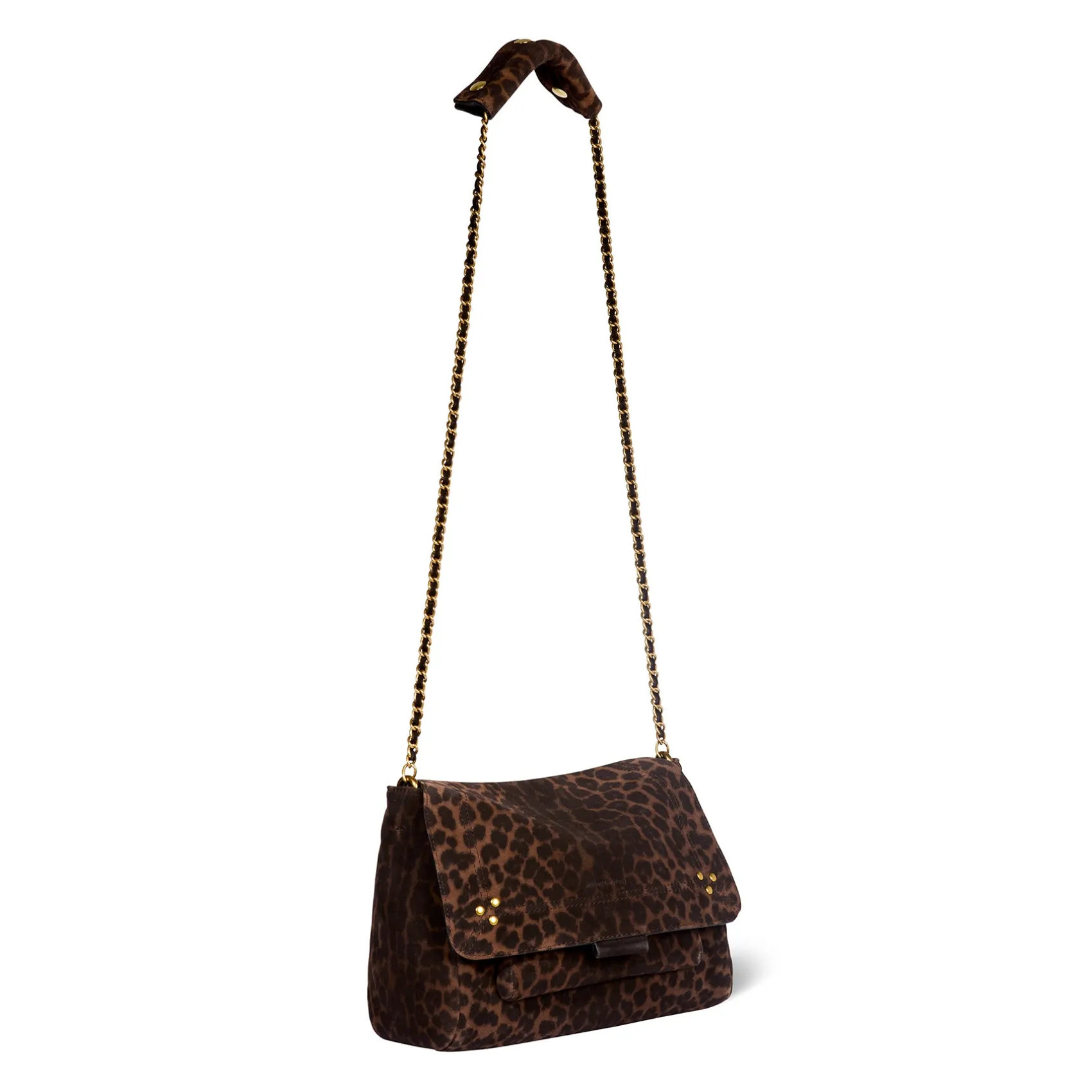 Adjustable chain and leather shoulder strap measuring 105 cm. Wide leg shoulder belt. Flap with snap button closure. One small pocket under the flap. One exterior zipped pocket. One interior pocket. One key hook inside.