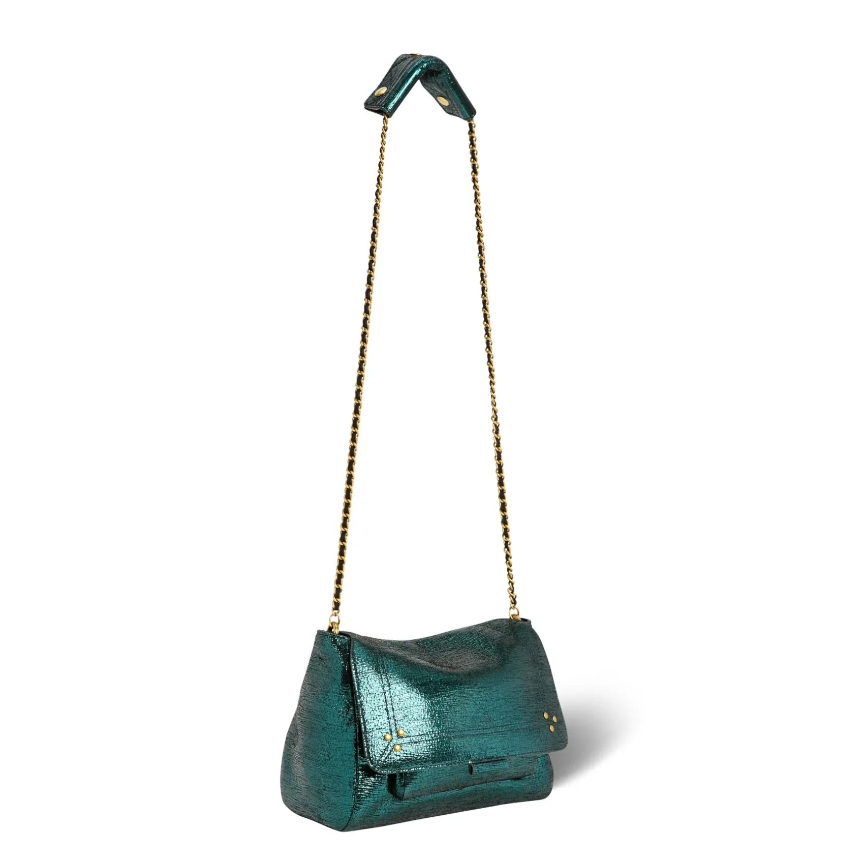 Adjustable chain and leather shoulder strap measuring 105 cm. Wide leg shoulder belt. Flap with snap button closure. One small pocket under the flap. One exterior zipped pocket. One interior pocket. One key hook inside.