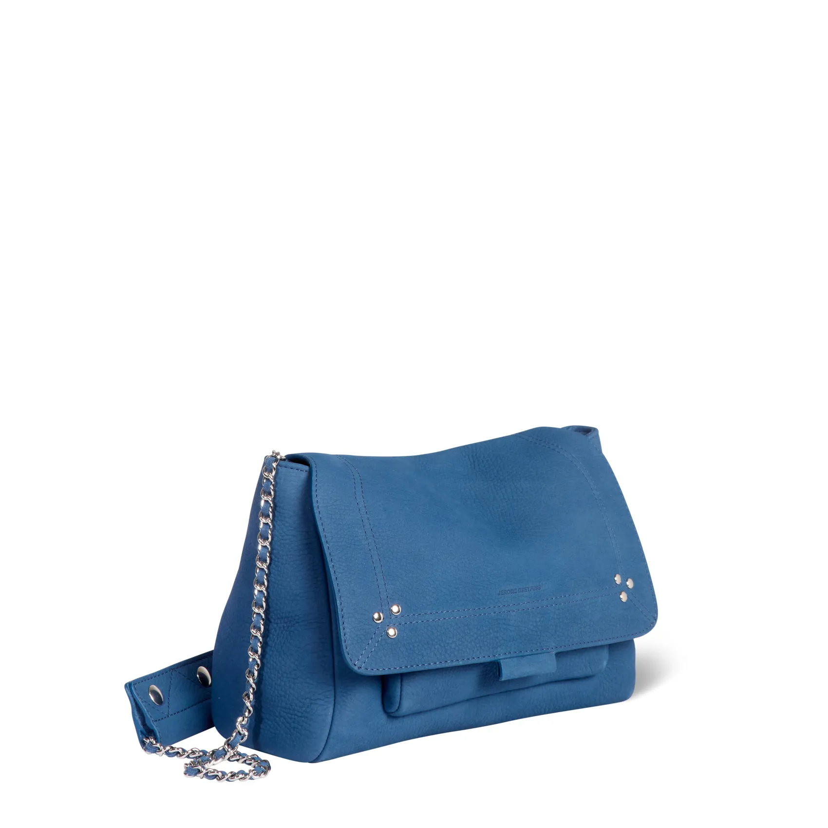 Adjustable chain and leather shoulder strap measuring 105 cm. Wide leg shoulder belt. Flap with snap button closure. One small pocket under the flap. One exterior zipped pocket. One interior pocket. One key hook inside.