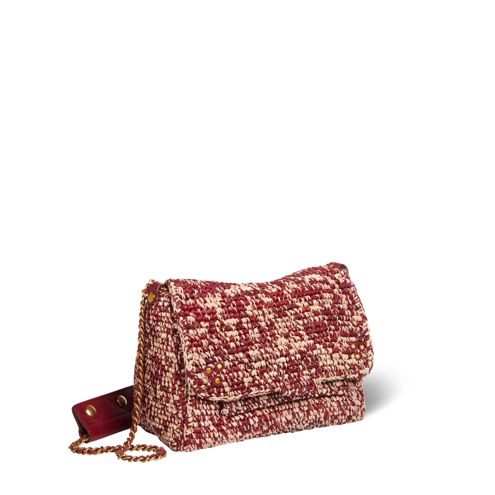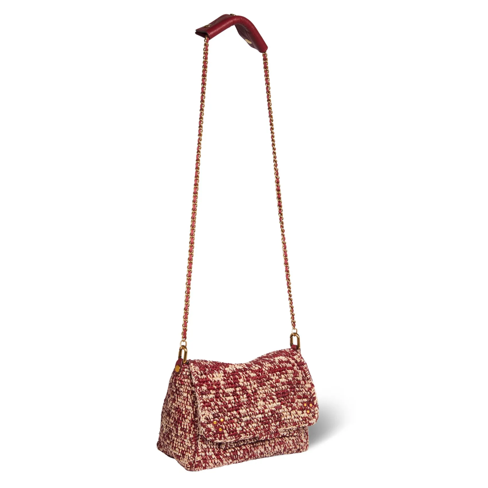 Adjustable chain and leather shoulder strap measuring 105 cm. Wide leg shoulder belt. Flap with snap button closure. One small pocket under the flap. One exterior zipped pocket. One interior pocket. One key hook inside.