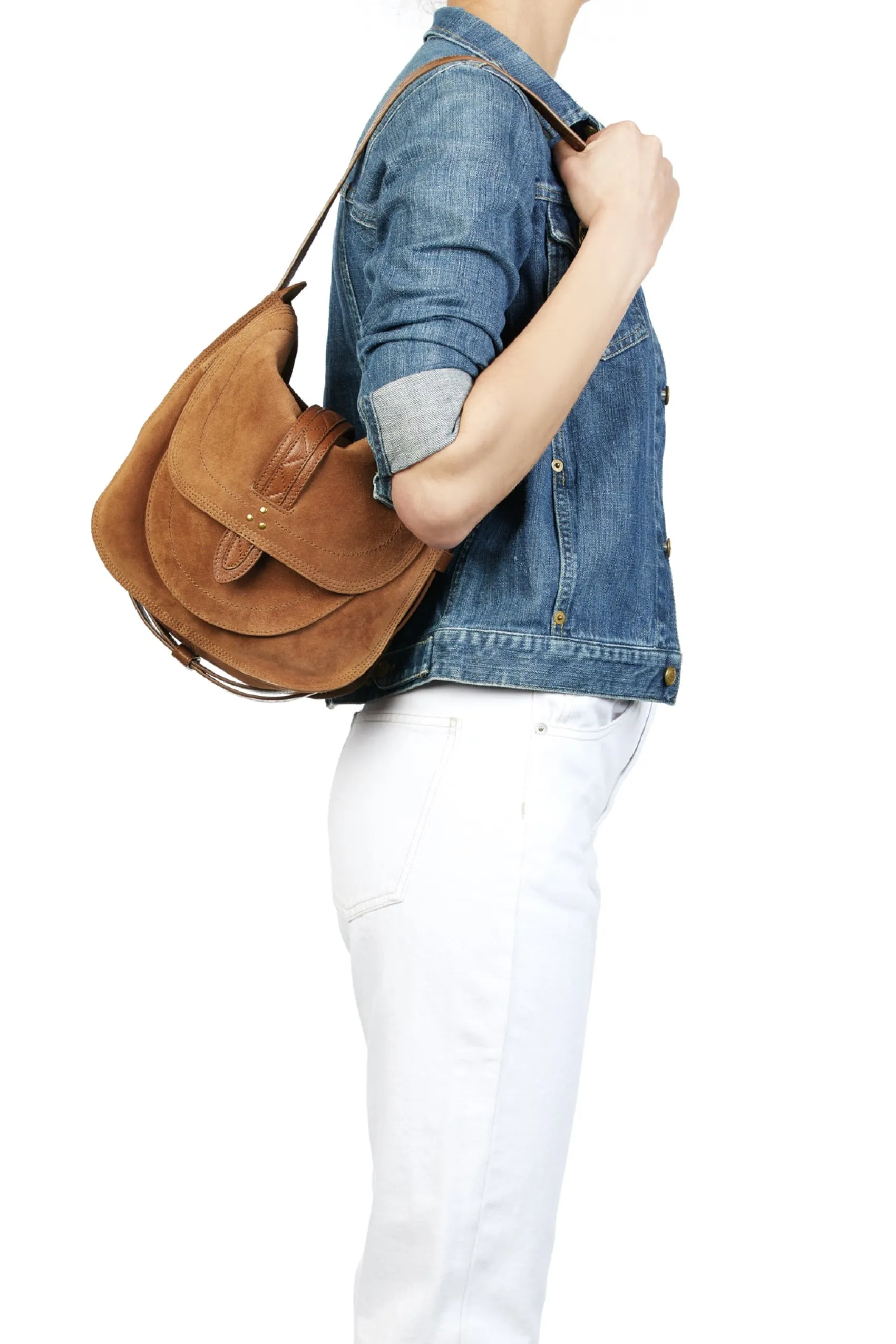 Closing with a leather flap. A removable leather shoulder strap, measuring a maximum of 82 cm. One outside pocket. One inside pocket with a fully zipped compartment. A keychain link inside the bag.