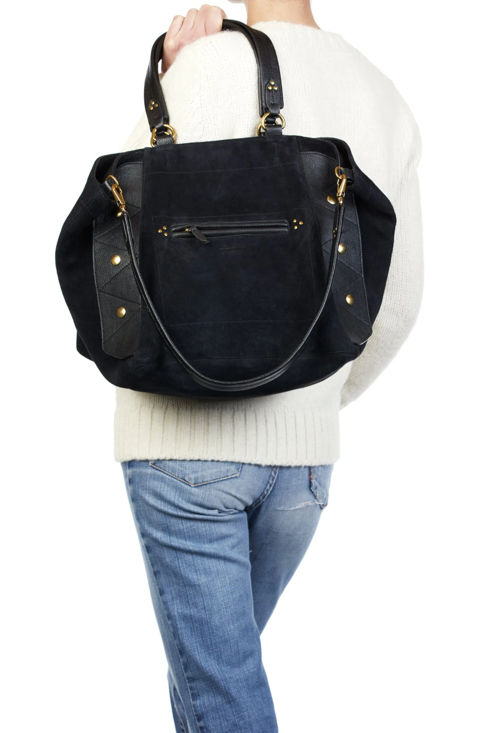 Zip closure. Two leather handles and a removable leather shoulder strap. One external zipped pocket. One inside pocket. A key link inside the bag.